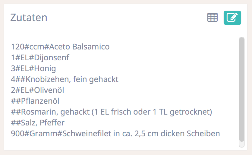 Zutatenbearbeitung in Textform. Rezeptsuite erkennt anhand der Textformatierung die einzelnen Zutaten und übernimmt diese. Das geschieht indem das Zeichen '#' zwischen Menge/Einheit und Einheit/Bezeichnung eingesetzt wird. In jeder Zeile muss es zwei solche (Trenn-)Zeichen geben.